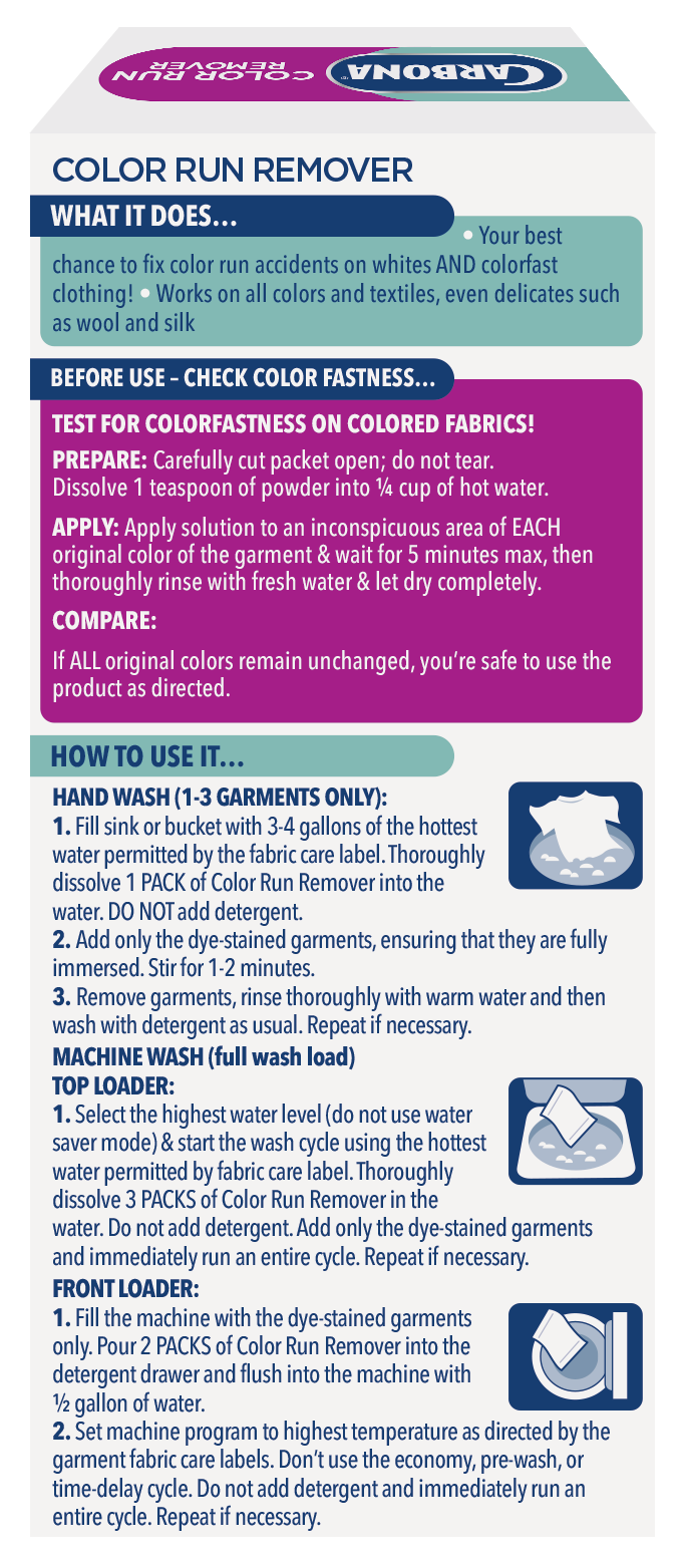 - Fill sink or bucket with 3-4 gallons of the hottest water permitted by the fabric care label. Thoroughly dissolve 1 PACK of Color Run Remover into the water. DO NOT add detergent.